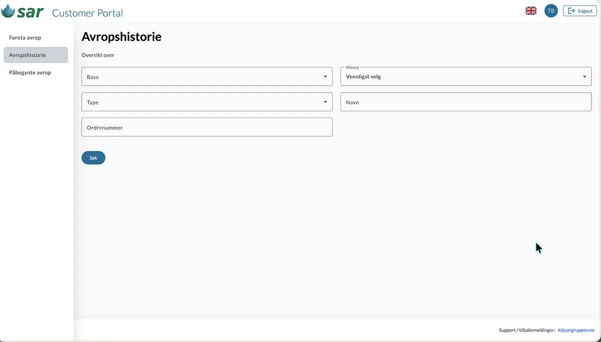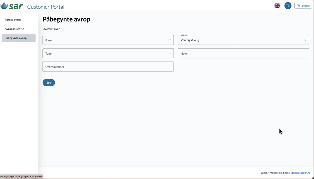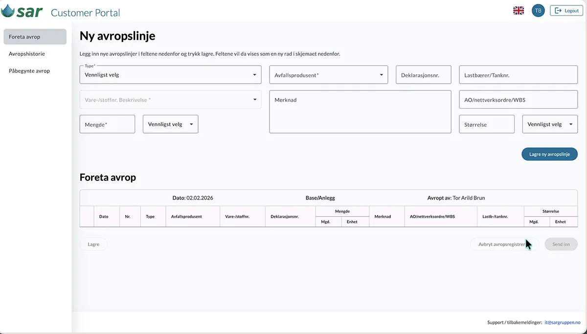 SAR kundeportal er en webbasert løsning som gir våre kunder mulighet til å registrere oppdrag for henting, tømming og behandling av avfall direkte i portalen. Kundene får full oversikt over alle innmeldte avrop, med status og historikk, samtidig som all relevant kommunikasjon og dokumentasjon er samlet på ett sted. Dette erstatter tidligere løsninger som ikke gir god nok oversikt og kontroll.
